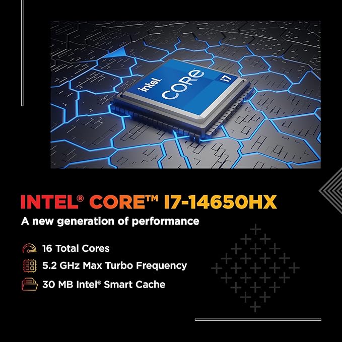 - Processor, Memory & Storage: Intel Core i7-14650HX (up to 5.2 GHz with Intel Turbo Boost Technology, 30 MB L3 cache, 16 cores, 24 threads)| Memory: 24 GB DDR5-5600 MT/s (1 x 24 GB) | Storage: 1 TB PCIe Gen4 NVMe M.2 SSD